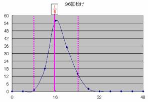 投げる回数が4倍になると、ばらつき幅はどの程度狭くなるものか・・・。